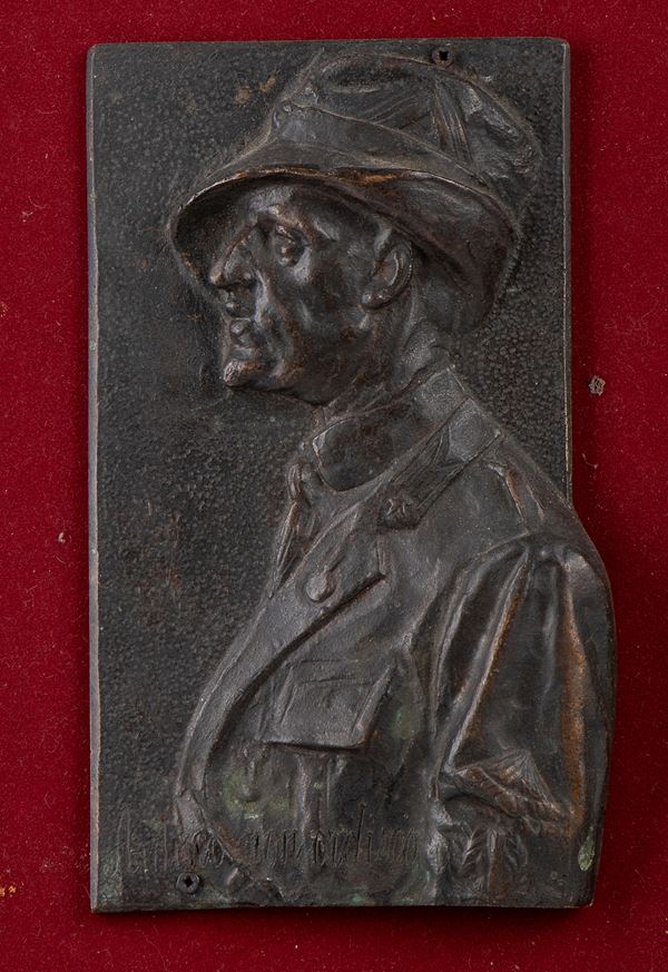 Bella placca in bronzo a rilievo, con Gabriele d'Annunzio ritratto di profilo, in uniforme da comandante degli Arditi di Fiume, con motto inciso alla base ARDISCO NON ORDISCO. Applicata in cornice d'epoca, dalla quale può essere rimossa. In ottime condizioni. Misure della sola placca circa cm.13x23