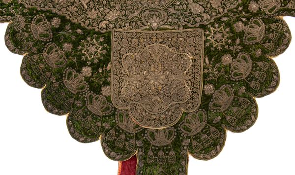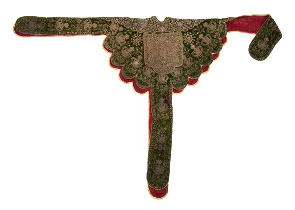 Antica bellissima stola cerimoniale per membro della casa Imperiale Etiope, in velluto verde con impressionanti ricami floreali e corone imperiali di canottiglia argento, foderata all'interno di tela multicolore. In ottimo stato, rara di così grande qualità.