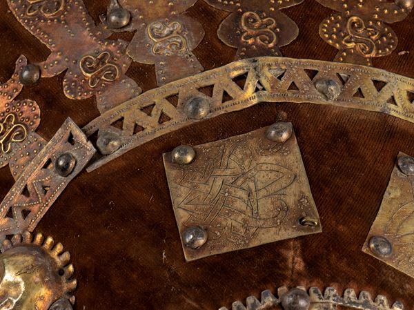 Etiopia, antico scudo da Ras in pelle ricoperta di velluto marrone e decorato di piastrine metalliche dorate, al verso è foderato in pelle rosso bruna, la forma e la fattura sono tipiche degli scudi di fine XIX secolo. In ottimo stato.