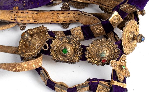 Bardatura da cavallo in pelle e velluto violaceo con inserti di metallo dorato e vetri colorati ad imitazione di pietre preziose, facente parte di corredo di un importante Ras o membro della famiglia imperiale, in ottimo stato