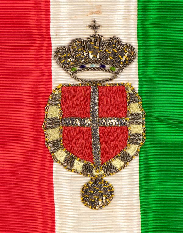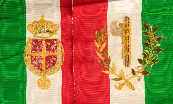 Fascia da podestà (sindaco) del ventennio fascista, periodo 1927-1942, in seta e ricami (fascio littorio con frange di alloro, stemma Savoia con scudo crociato e collare dell'Annunziata), completo delle sue frange e del fiocco centrale. Insieme in perfette condizioni, con la sua scatola in alluminio, originale.