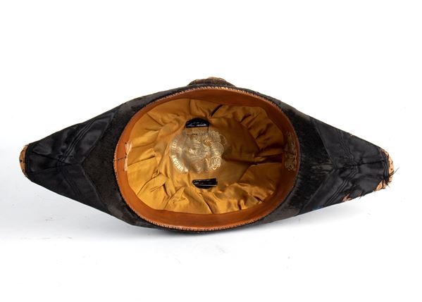 In feltro bordato di seta marezzata nera, con coccarda e tubolari di grovigliola dorata grandi da ufficiale superiore, coccarda di seta, conservata in scatola. Buone condizioni, segni di usura ai nastri.