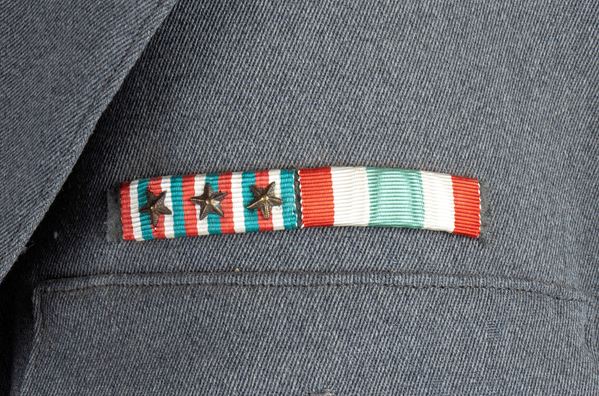 Bellissima giubba da ufficiale dei lancieri di Aosta, in cordellino grigio con bavero e filettature rosso scarlatto, gradi alle maniche, controspalline con fregio di arma in canottiglia dorata. In ottimo stato.
