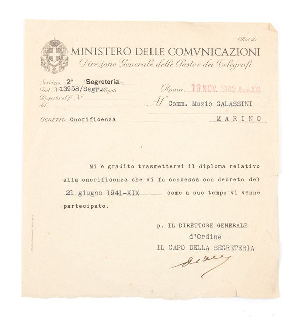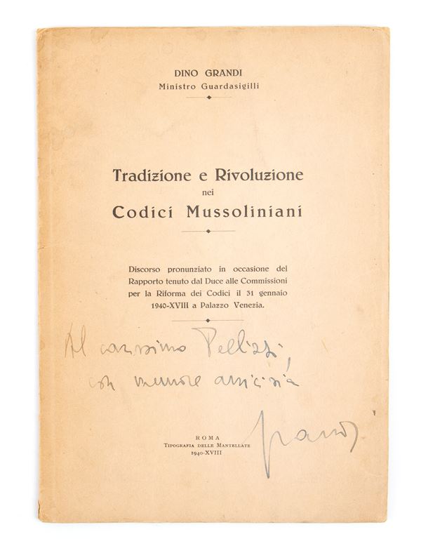 Lotto composto da un libretto dal titolo "Tradizione e rivoluzione nei codici mussoliniani" con dedica e firma autografe ad inchiostro nero di Dino Grandi, libretto dell'opera dannunziana Cabiria, e lettera di assegnazione onorificenza cavalleresca. Mediocri condizioni.