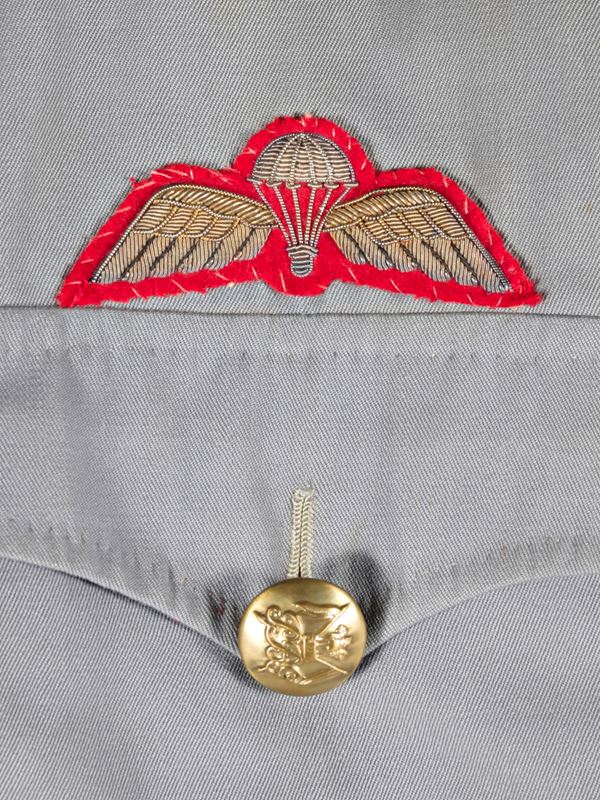 In diagonale grigio con collo amaranto caricato dei fregi di specialità in metallo bianco, spalline a maglia di ferro, in ottimo stato.