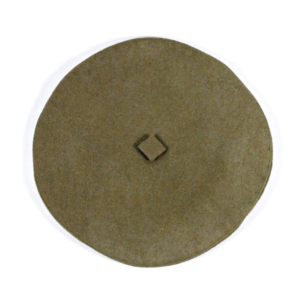 Basco in panno di lana cachi costruito in cinque pezzi, fregio frontale del genio in filo nero, in ottimo stato.