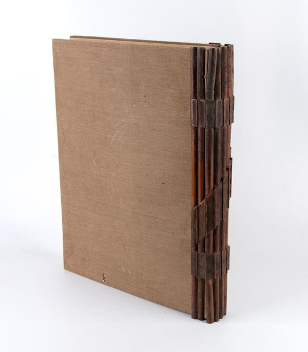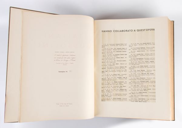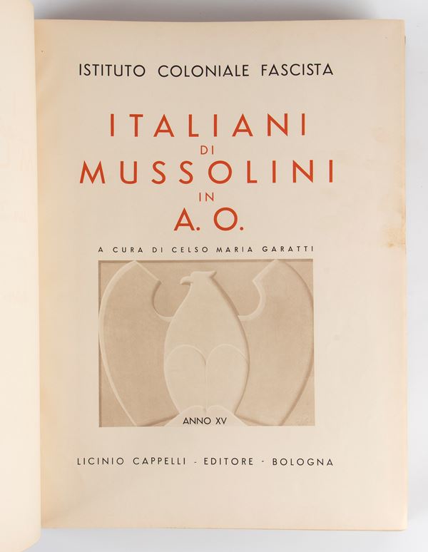 Volume monumentale dal titolo ITALIANI DI MUSSOLINI IN A.O. Edizione di lusso numerata 24, copertina in tela beige, dorso e piatto con fascio littorio applicato (lamierino d'ottone , legno). Pubblicazione dell'Istituto Coloniale Fascista, a cura di Celso Maria Garatti, Anno XV dell'era fascista (1937).