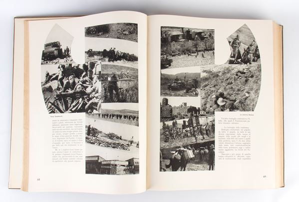 Licinio Cappelli Editore Bologna. In folio (mm. 404x310). Pp. 569, [5] con mappa in b/n della marcia su Gondar, 2 mappe del Corno d'Africa a colori fuori testo. Fotografie dell'Istituto Luce e illustrazioni di Gigi (Luigi Del Giudice). In ottime condizioni.
