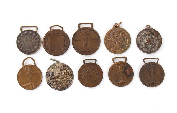 Undici medaglie , prevalentemente di campagna, in bronzo e metallo argentato, tra cui una Marcia su Roma di bronzo, buono stato.