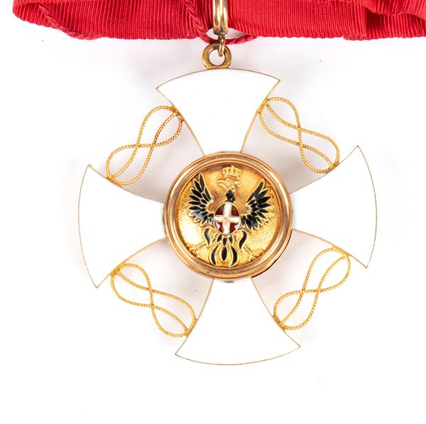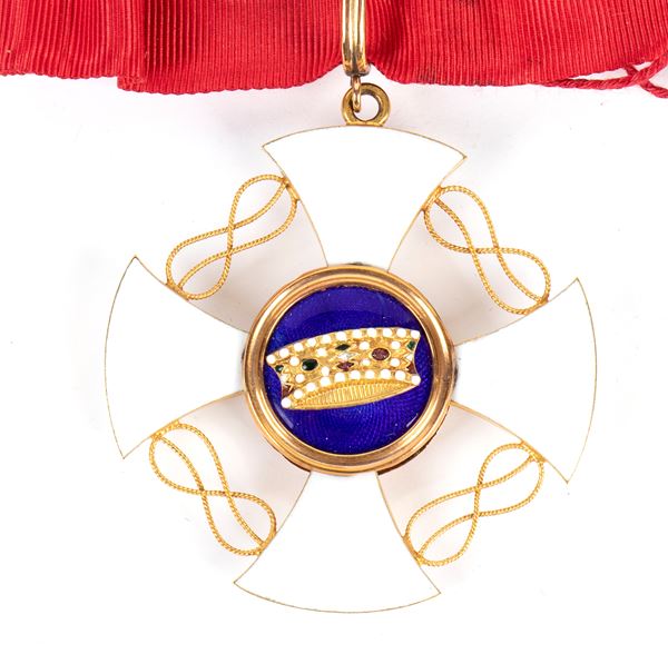 Bellissima insegna in oro di Commendatore della Corona d'Italia, oro e smalti policromi, conservata in astuccio originale in marocchino rosso con impresso il monogramma del sovrano regnante, U coronata, in ottimo stato, bellissima opera di oreficeria di fine XIX secolo