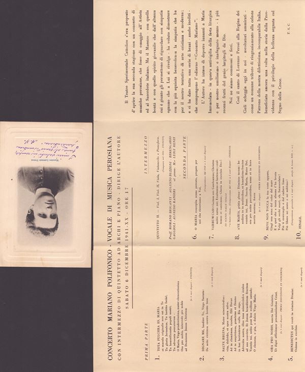 Pieghevole del "Concerto Mariano Polifonico Vocale di musica Perosiana - Dirige l'Autore - Sabato 6 Dicembre 1941" con dedica e firma autografe di Don Lorenzo Perosi, datato 1941.