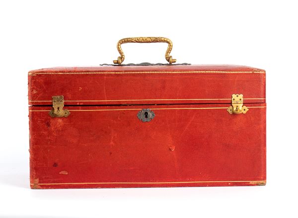 Cofanetto porta stola, o porta zuccotto, in legno rivestito in similpelle rossa, con logo di Papa PIO XI impresso in oro sul coperchio. Ferramenta in metallo dorato. Misure circa cm.31x18x15. Condizioni buone, segni d'uso, mancante della fodera interna, serratura da rivedere.