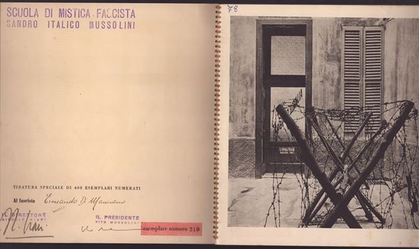 Volume SPECIALE edito dalla Scuola di Mistica Fascista SANDRO ITALICO MUSSOLINI. Impaginato da Giuseppe Pagano, realizzazione grafica dell'Istituto Raffaello Bertieri, in Milano, 1940 anno XVIII - In 8° quadrato, circa cm.24 x 24, pp. 82, (4), brossura editoriale con illustrazione fotografica ai piatti del "covo", testo in rosso e in nero, interamente illustrato con fotografie in b.n. nel testo, legatura a spirale, pagine piegate alla cinese. Rarissima edizione in tiratura speciale di 400 esemplari numerati, in cofanetto originale rivestito di tela di sacco, con fascio littorio e testo IL COVO stampato ad inchiostro nero. Questo è l'esemplare numero 210 dedicato al fascista E.d.M. con timbri del direttore Nicolò Giani e del presidente Vito Mussolini, accompagnati dalle rispettive firme autografe. Perfette condizioni.