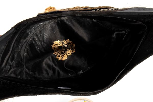 Antica feluca di ordine cavalleresco o gentiluomo di Camera di Sua Santità, feltro bordato di piume di struzzo bianche, cappio a ricami oro su fondo nero con coccarda e bottone mezzo tondo con chiavi e tiara, fodera in seta nera con impresso lo stemma araldico del Papa regnante Leone XIII (1878-1903); in ottimo stato.