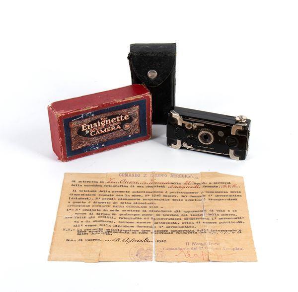 Rarissima macchina fotografica THE ENSIGNETTE - DAYLIGHT LOADING CAMERA - A FOLDING CAMERA FOR THE WAISTCOAT POCKET - Made in Houghtons London - Completa della sua scatola originale. Usata in ambito militare come testimoniato dal foglio che la accompagna del COMANDO 2' GRUPPO AEREOPLANI - Si Autorizza Il Tenente .... Comandante Della 22' Squadriglia A Servirsi Della Macchina Fotografica Di Sua Proprietà ENSIGNETTE Formato 4x6 - 13 APRILE 1917 - IL MAGGIORE COMANDANTE DEL 2' GRUPPO AEROPLANI - con firma autografa ad inchiostro rosso di ERCOLE CAPUZZO .