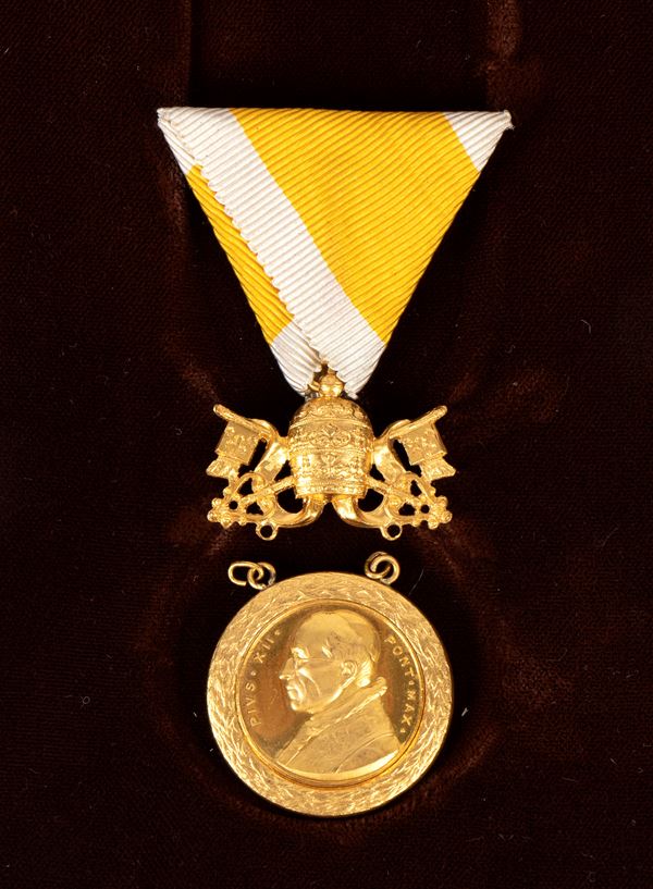 Medaglia Bene Merenti, epoca Pio XII, bronzo dorato, conservata in astuccio, da riammagliare la catenella, altrimenti in ottimo stato