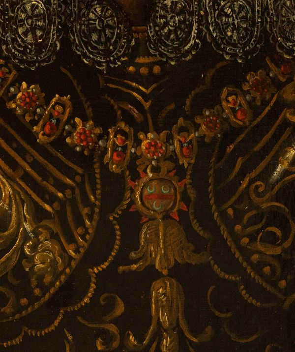 Il personaggio effigiato indossa il collare dell'Ordine di Santo Stefano di Toscana caricato di stemma con tre crescenti in campo d'oro con una banda rossa.