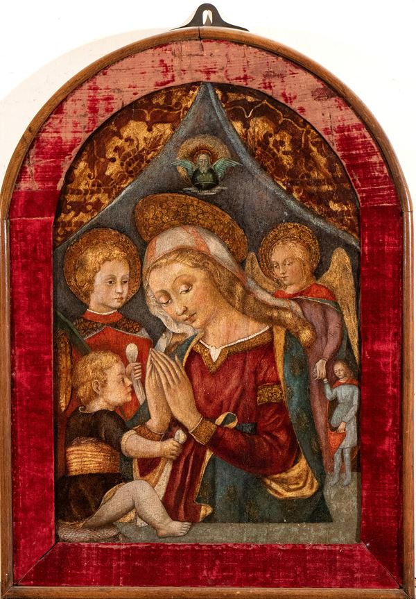 Figlio e allievo di Bicci di Lorenzo, Neri di Bicci è un esponente emblematico della fase della pittura fiorentina che si sviluppa nei decenni centrali del Quattrocento, ponendosi a cavallo tra gli ultimi fuochi tardo-gotici (di cui rimarrà sempre traccia evidente nei suoi colori sgargianti, nell'attenzione ornamentale, nella preziosità dei tessuti e nell'indifferenza alle regole matematiche della prospettiva) e un prudente ma inevitabile aggiornamento alla cultura figurativa più propriamente rinascimentale, mediata da Beato Angelico, Benozzo Gozzoli e Filippo Lippi. Ritroviamo questa combinazione di caratteri stilistici anche nel notevole dipinto di destinazione devozionale che qui si presenta, giudicato "opera tipica di Neri di Bicci" da Giuliano Briganti: attribuzione che ancora oggi appare puntuale e condivisibile, se si considerino le strette relazioni formali che uniscono la nostra Vergine in preghiera di fronte a Gesù Bambino all'Annunciazione con Dio Padre, Profeti e santi della Galleria dell'Accademia di Firenze, all'Annunciazione della chiesa di S. Lucia al Borghetto di Tavernelle Val di Pesa, o ancora alla Madonna con Bambino e santi del Museo di San Miniato (PI).