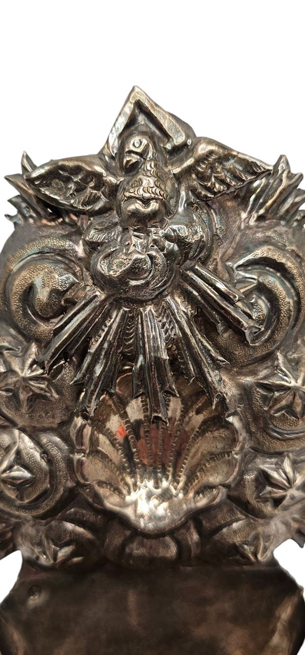 la parte superiore sbalzata e cesellata a raffigurare la colomba dello Spirito Santo con l'aureola triangolare, simbolo della Trinità, inserita tra nuvole e stelle, con al centro una conchiglia. Il bacino a sua volta è sbalzato e cesellato con motivi geometrici e floreali.