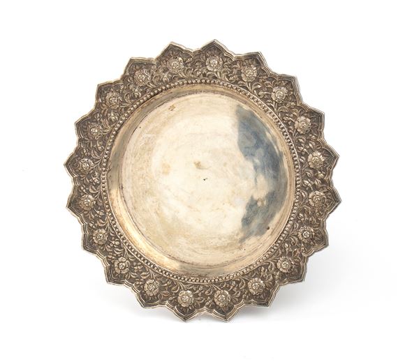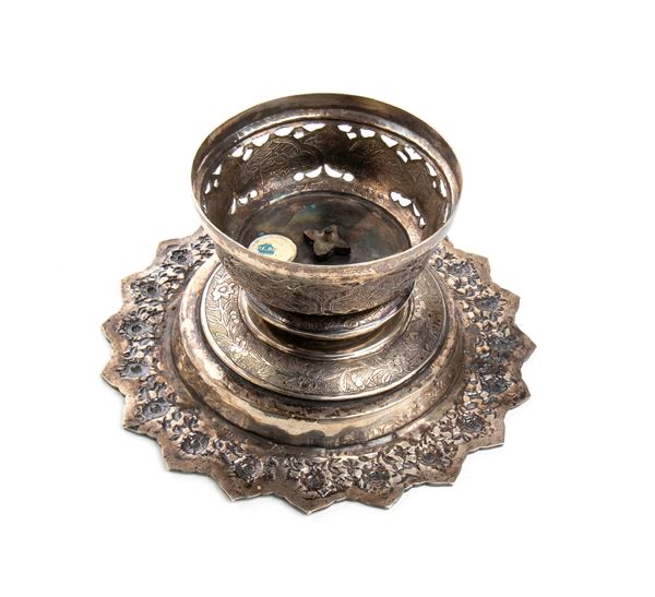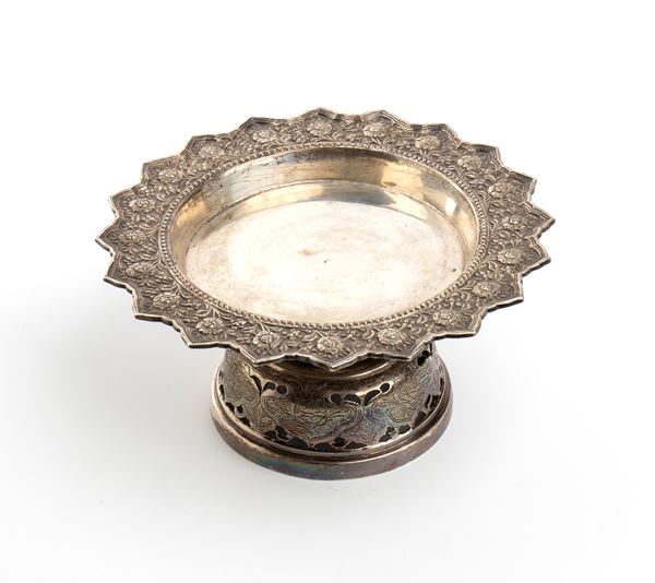 con base circolare, la parte sagomata presenta un motivo fogliato e floreale ripetuto.