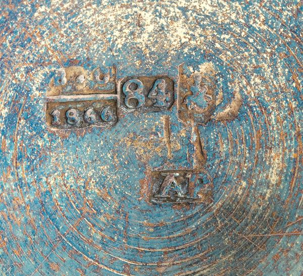 Punzonato con il marchio polifunzionale per l'argento al titolo di 84 zolotniks (875/1000) in uso in San Pietroburgo nel 1866, assaggiatore Viktor Vasilyevich Savinky. Maestro argentiere sconosciuto.