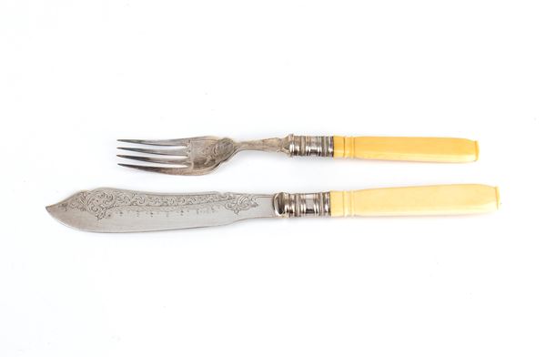Servizio da pesce vittoriano inglese in metallo e avorio, Fine XIX secolo