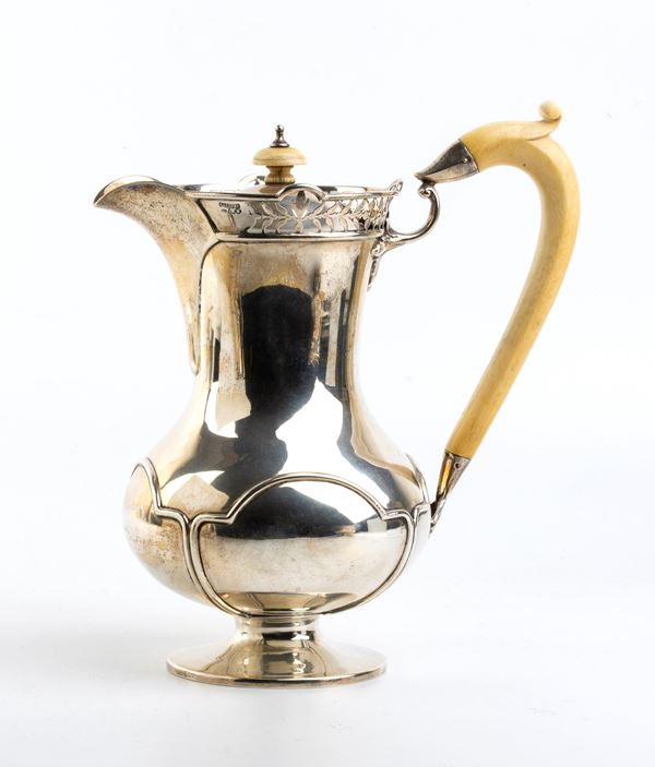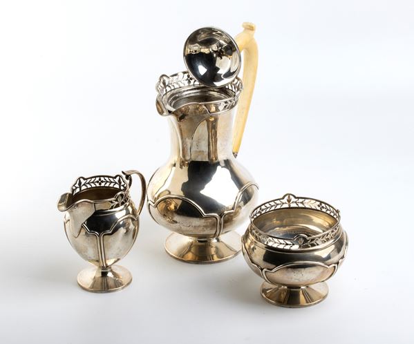 composto da caffettiera, teiera con manico in avorio di elefante (Elephas maximus Linnaeus, 1758 o Loxodonta africana Blumenbach, 1797), zuccheriera e lattiera, poggiante su piede circolare con manici ad ansa e bordo superiore traforato.