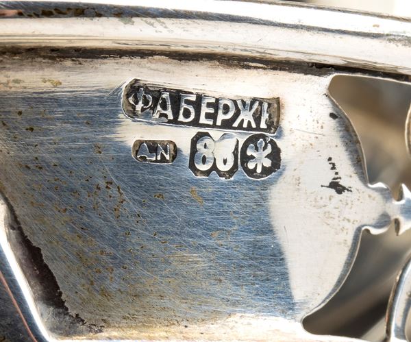 Punzonati con i marchi per l’argento al titolo di 88 zolotnik (916/1000) in uso a San Pietroburgo tra la fine del XIX e l'inizio del XX secolo, con l'iscrizione Fabergé in cirillico e con le iniziali del maestro "AN" per Anders (Antti) Nevalainen (1° gennaio 1858 - 1933).
