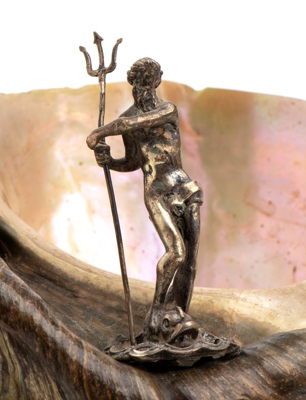 Ad arricchire la lavorazione ispirata da temi marittimi, naturalistici e mitologici, al di sopra della conchiglia, si erge la figura scolpita di Nettuno, o Poseidone, dio dei mari, rappresentato con imponenza e maestosità. Egli tiene in mano un tridente, simbolo del suo dominio marino, ed è raffigurato in una posa dinamica, nell'atto di cavalcare un delfino.