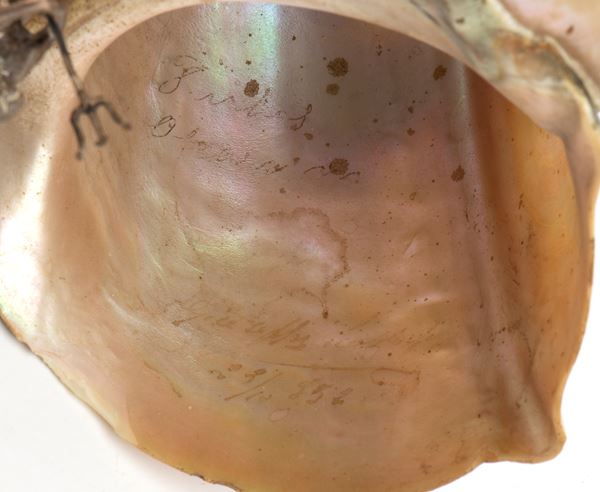 poggiante su una base circolare arricchita con decorazioni a incisioni geometriche che si dispongono in motivi ripetuti. Al centro della base si innalza una grande conchiglia naturale (Turbo Marmoratus).
