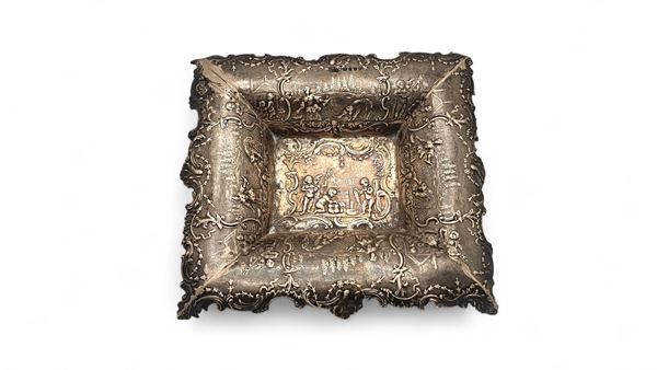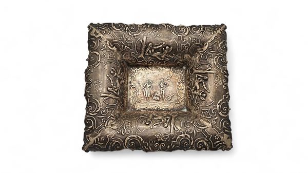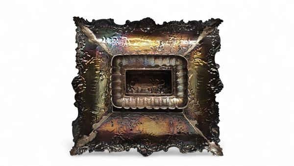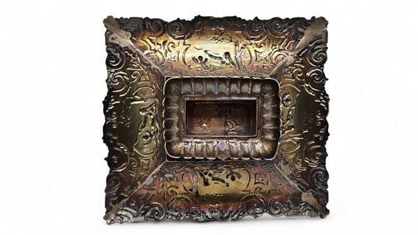 di forma rettangolare, decorata con volute ed elementi vegetali che incorniciano una scena, ripetuta quattro volte sulle parti laterali, raffigurante probabilmente la dea Artemide, spesso identificata con un arco, come in questo caso, accompagnata da Eros. Al centro, una scena cavalleresca immersa in una campagna. Il lotto presenta una base rettangolare sagomata con fusto liscio.