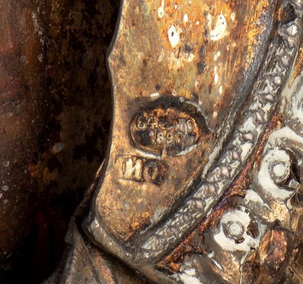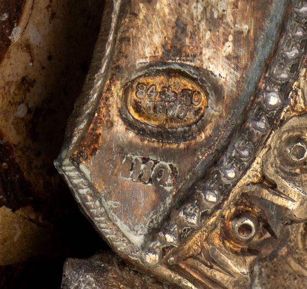 Punzonata con il marchio polifunzionale per l'argento al titolo di 84 zolotniks (875/1000) in uso a Mosca nel 1890 assaggiatore Oleks Lev Fedorovich (1890-1896).