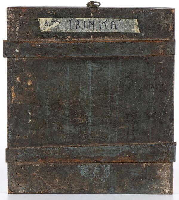 tempera su tavola; la Santissima Trinità è dottrina fondamentale e più importante delle chiese cristiane; in essa sono rappresentati Dio Padre, creatore del cielo e della terra, Gesù Cristo, il Figlio generato dal Padre prima di tutti i secoli, e lo Spirito Santo che il Padre e il Figlio mandano ai discepoli di Gesù per far loro comprendere e testimoniare le verità rivelate.