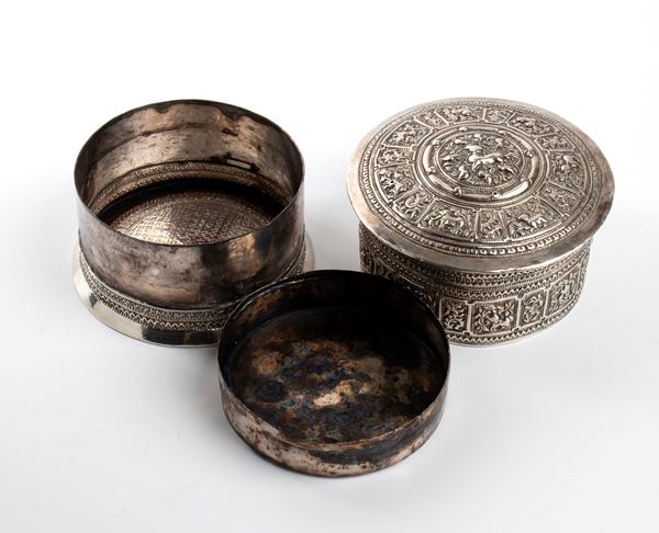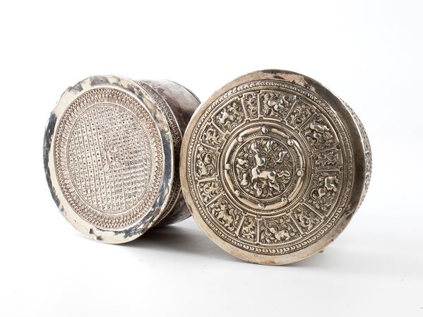 sbalzata e cesellata con motivi floreali e animali incorniciati da figure geometriche.