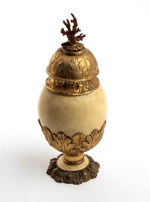con montatura in metallo dorato alle due estremità, decorata con foglie di quercia, riprese anche sul coperchio a forma di cupola, dotato di una presa in ramo di corallo rosso del Mediterraneo (Corallum Rubrum). Il tutto poggia su una base circolare appesantita, probabilmente non coeva, decorata con motivi floreali.