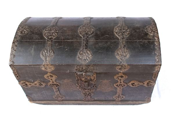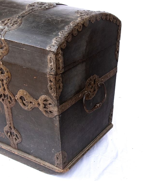 con rinforzi in ferro battuto e cesellato su tutta la superficie; sul fronte vi sono dipinti due simboli e la scritta S.L.M. ano 1730.