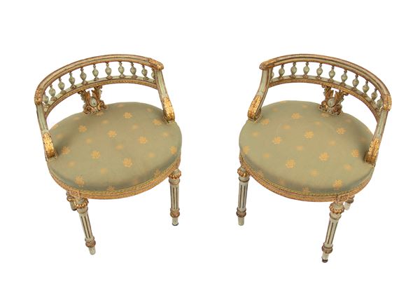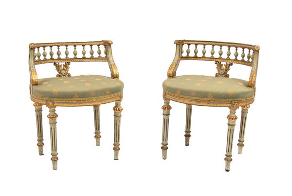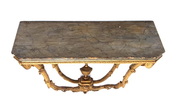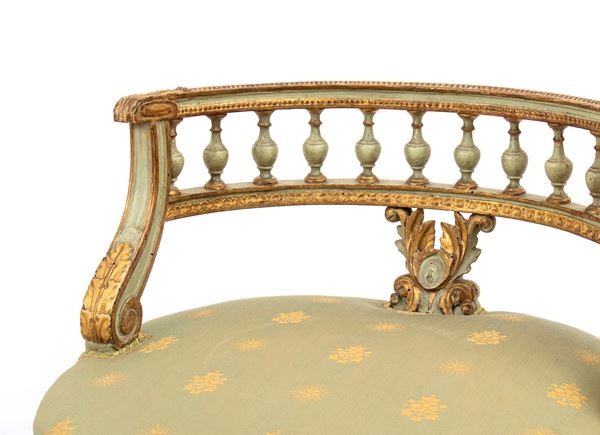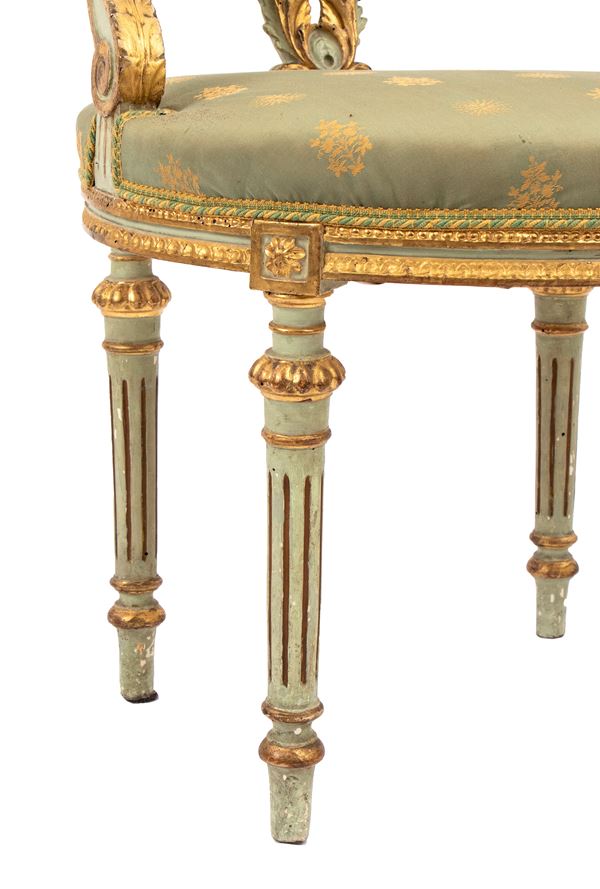 in stile Luigi XVI, le poltroncine in legno intagliato e dorato, la consolle con piano marmorizzato.