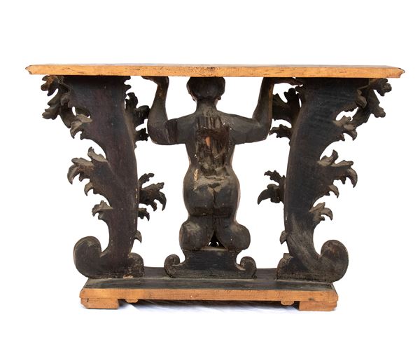 area centro Italia, piano supportato da volute floreali e figura femminile; basamento sorretto da quattro gambe a cipolla.