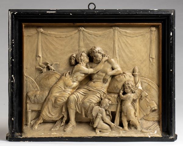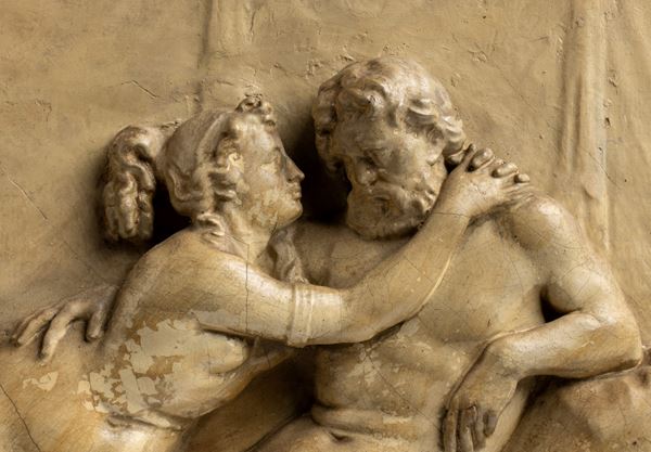 Coppia di bassorilievi italiani in gesso con scene mitologiche, XX secolo