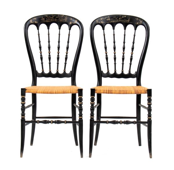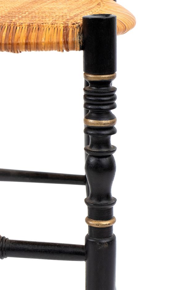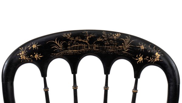 in legno ebanizzato, dipinte a motivi orientali in oro. Seduta in paglia.
