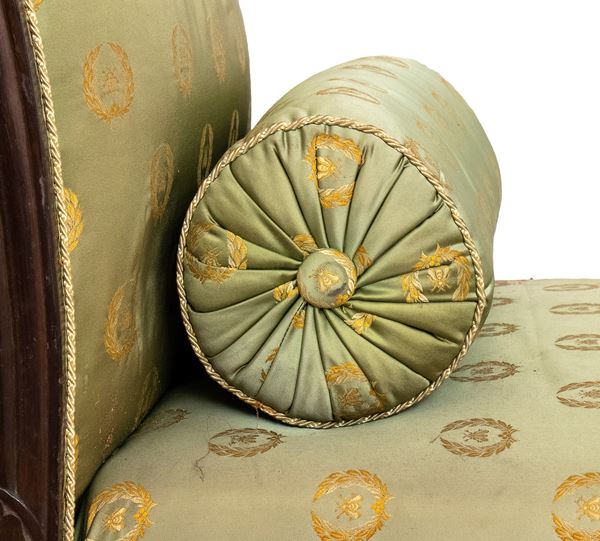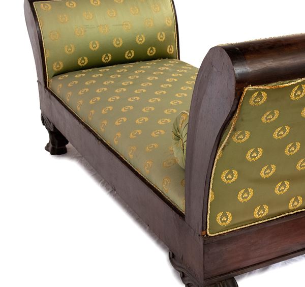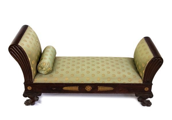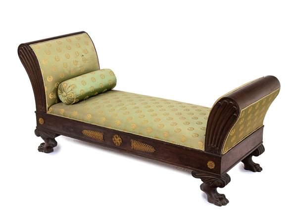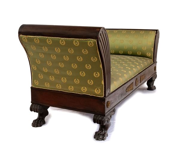 in legno di piuma di mogano, con applicazioni neoclassiche in bronzo dorato, da centro e sorretta da quattro gambe ferine.