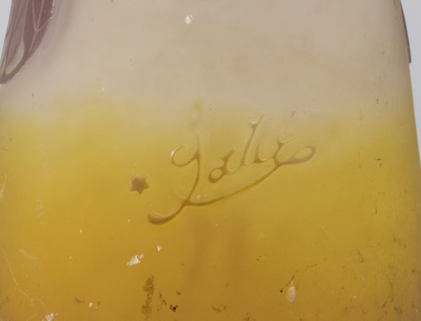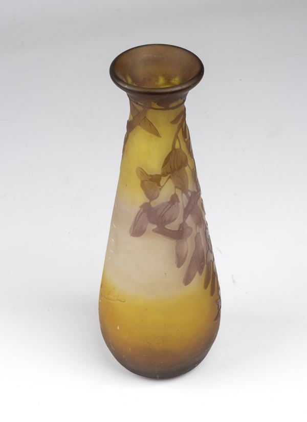 in vetro foderato di malva su fondo bianco sfumato, è decorato con glicine. Si tratta di una stampa industriale e il cammeo è inciso all'acido. Firmato.