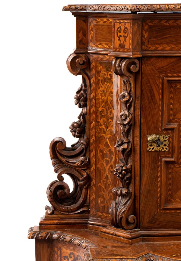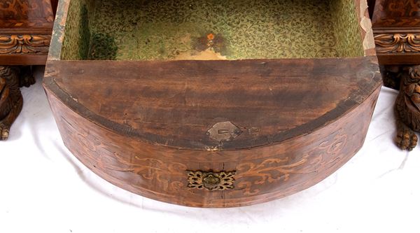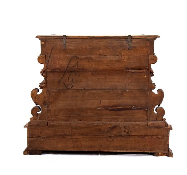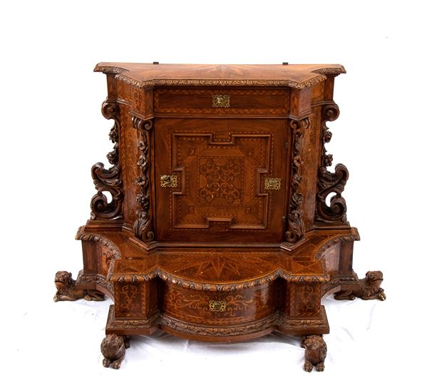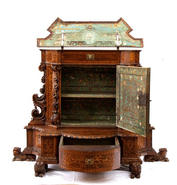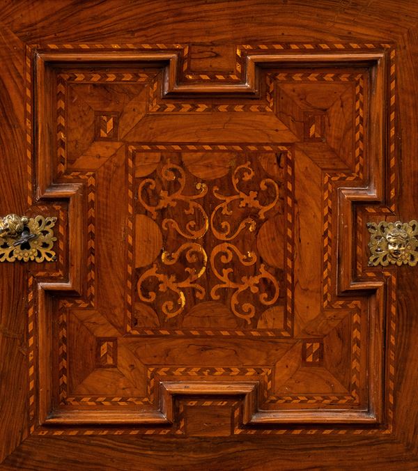 Italia settentrionale, finemente intarsiato in legno di frutto a motivi geometrici; la base sorretta da quattro leoni intagliati, ferramenta e chiavi coevi.