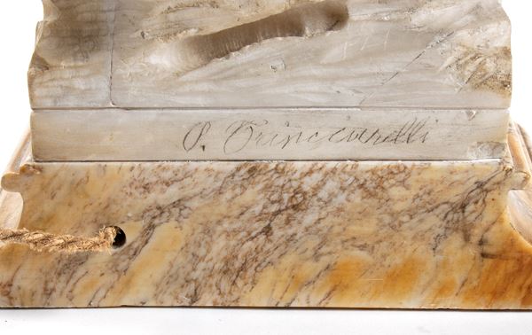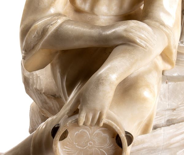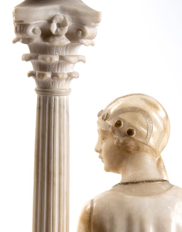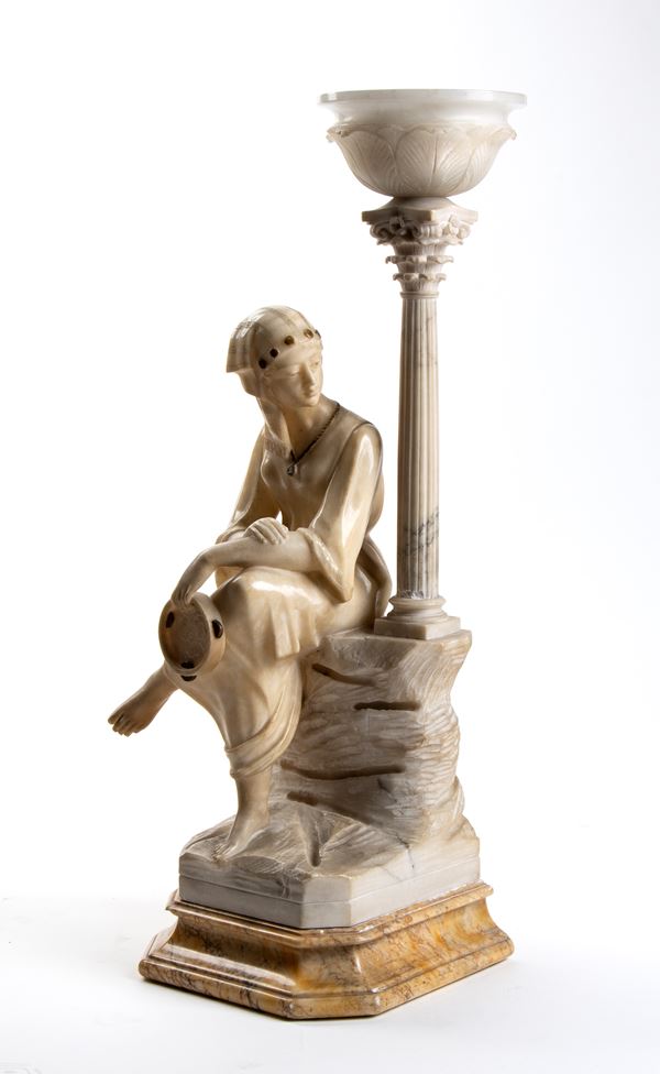 con figura di donna gitana in alabastro su base in marmo scuola italiana Art Nouveau. Sul retro della base firma non leggibile.