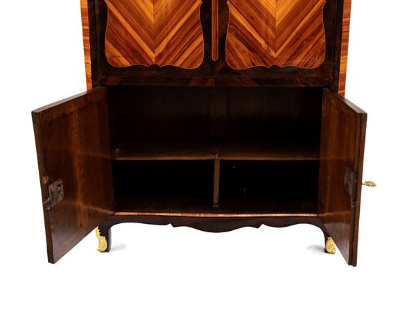 lastronato in palissandro e in legno di violetta, con applicazioni in bronzo dorato.