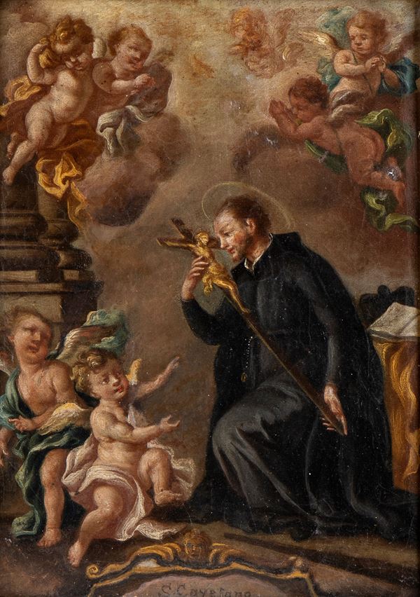 raffigurante la figura di San Gaetano, come riportato anche nell'iscrizione dipinta in basso al centro, inginocchiato con il Crocifisso in mano e circondato da figure di cherubini danzanti. Cornice in legno dorato.
