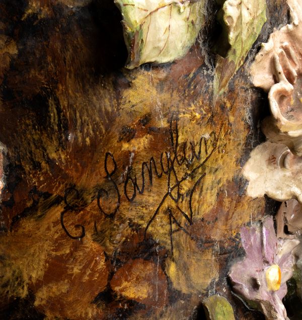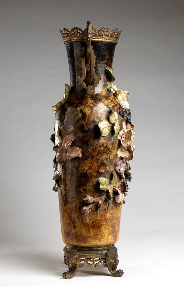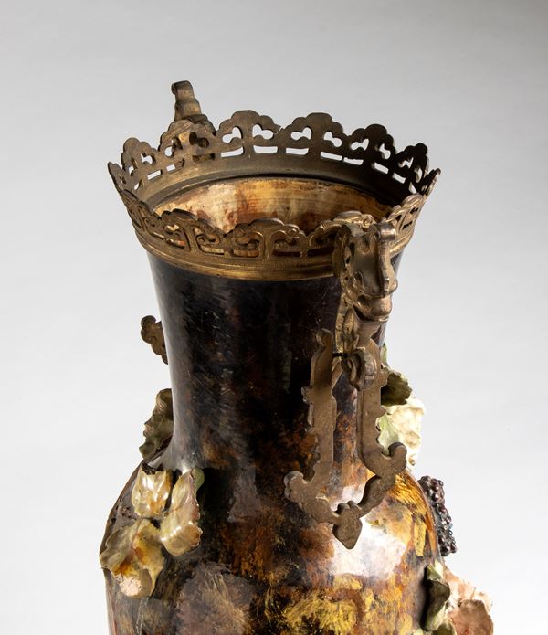 ornato da grandi disegni floreali applicati sul corpo smaltato, montatura in bronzo, manici con mascheroni.