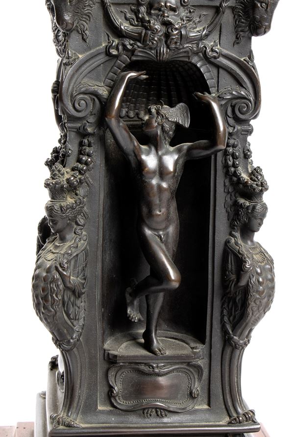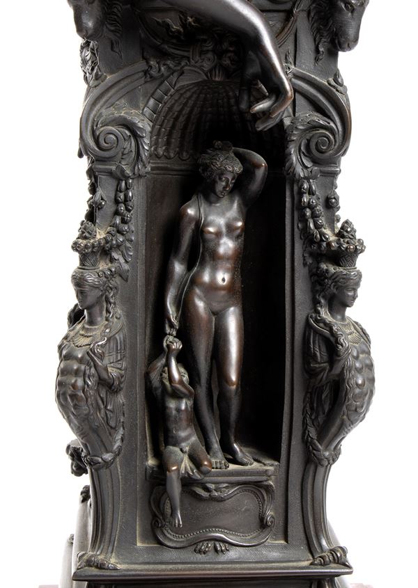 la fantastica statua di Perseo, in pieno stile neoclassico, poggia su un basamento con caproni e quattro divinità greche inserite in nicchie e una base in marmo rosso antico di forma quadrata.