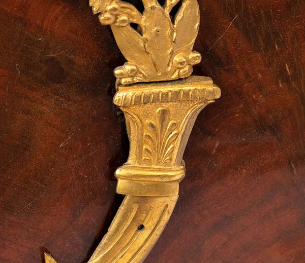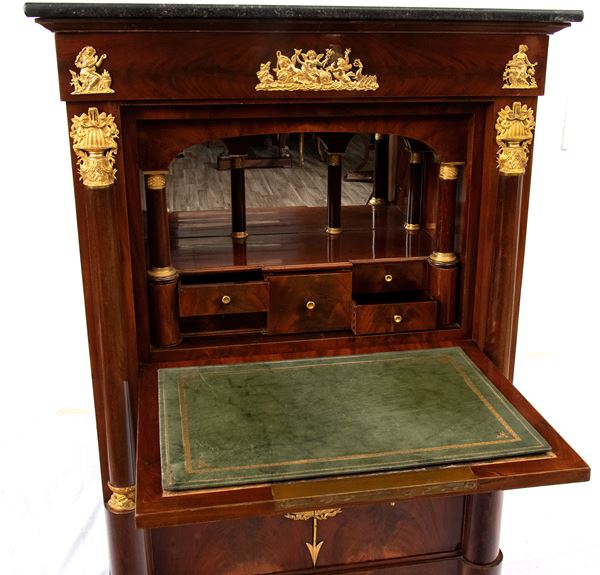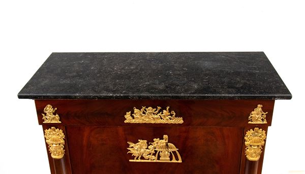 in piuma di mogano, adornato da applicazioni in bronzo raffiguranti scene neoclassiche, piano in marmo nero del Belgio