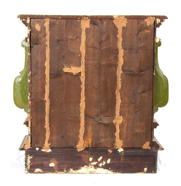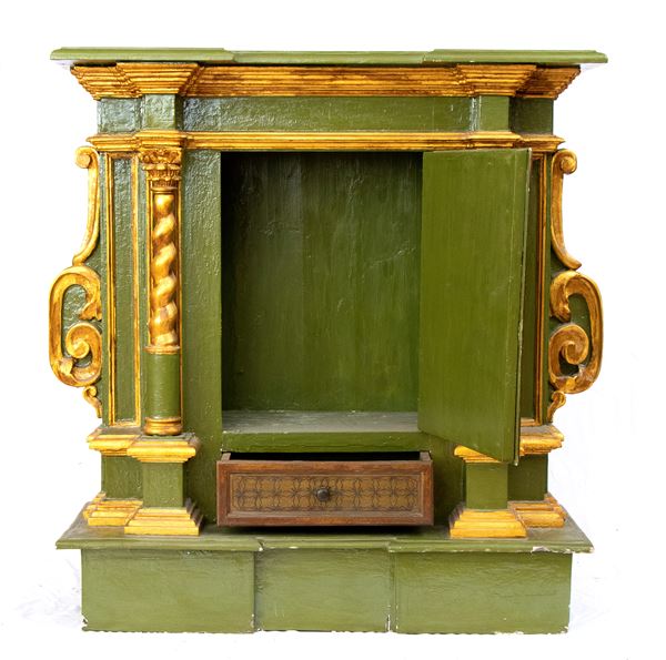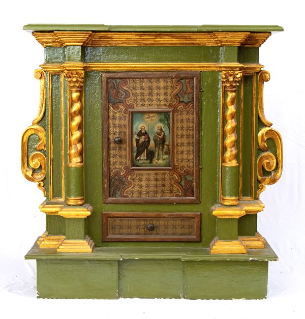 struttura architettonica in legno laccato verde con colonne a tortiglione e fregi dorati, cassetto sottostante e anta centrale dipinta con Sant'Antonio Abate e Sant'Onofrio.